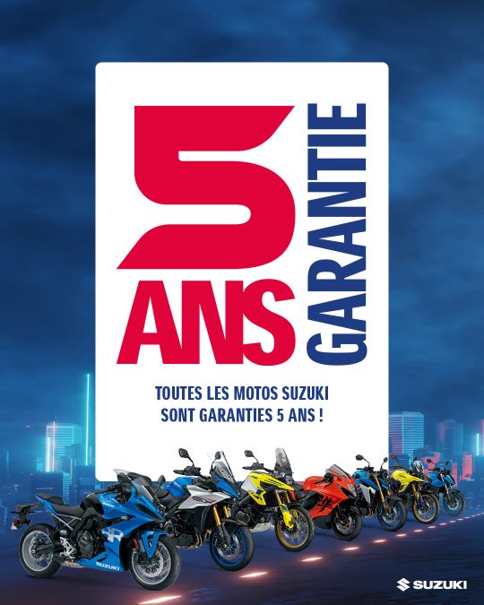 Suzuki France a le plaisir d’annoncer l’évolution de la garantie contractuelle à 5 ans pour l’ensemble des véhicules de la gamme Suzuki (hors motocross et compétition). Cette garantie contractuelle est également accompagnée de l’assistance routière et couvre toutes les motos neuves vendues depuis le 1er janvier 2024.
