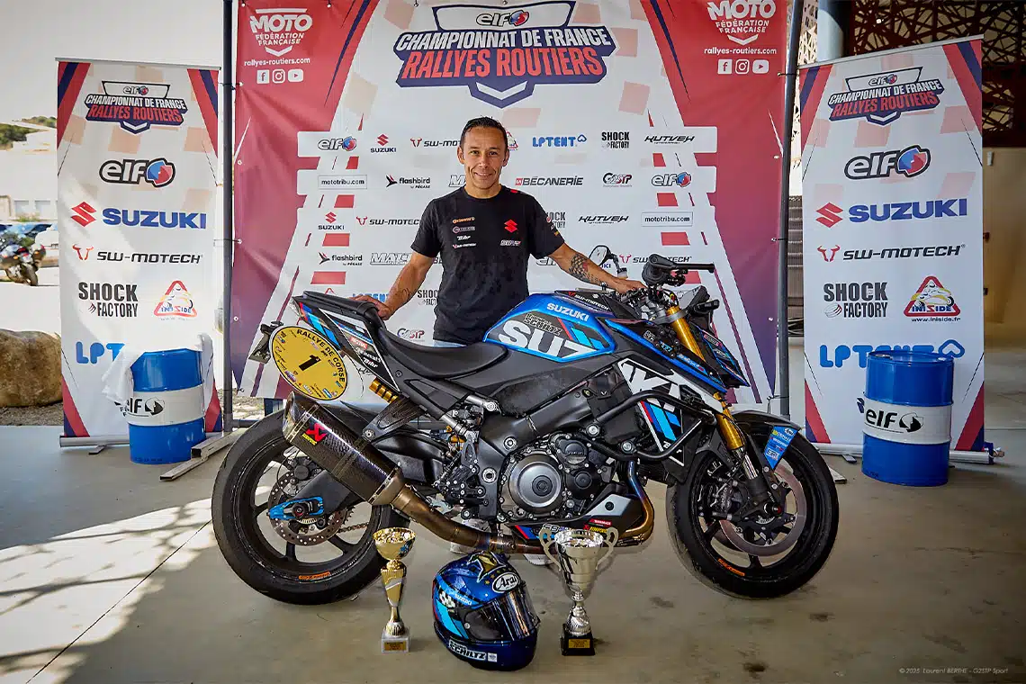 En remportant le Championnat de France des Rallyes Routiers 2024 au guidon de la GSX-8S, Bruno Schiltz devient ainsi le pilote le plus couronné de l’histoire de la discipline, avec 6 titres au compteur !