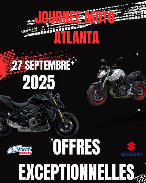 À l’occasion de la Journée Moto Atlanta , nous vous proposons une offre exceptionnelle, cumulable avec les offres spéciales Suzuki en cours :